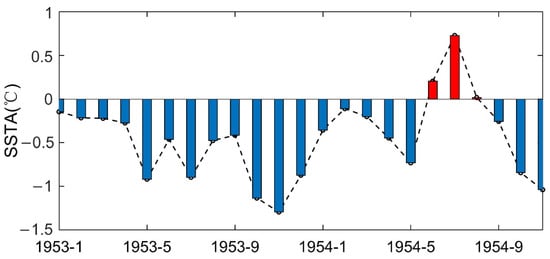 Figure 2 reveals that the SSTs in the Sea of Okhotsk region were unusually low in 1953, whereas the SSTs in regions of the central and eastern equatorial Pacific were relatively high. Figure 5 shows the SSTAs in the Sea of Okhotsk region from 1953 to 1954. SSTAs were continually present in the region between January 1953 and May 1954, with the annual SSTs averaging −0.61 °C in 1953 (the lowest SST is −1.3 °C). As shown in Figure 2, the usually low SSTs continued a necessary condition of blocking high formation. In 1954, El Niño turned into La Niña, during which time the central and eastern equatorial Pacific SSTAs switched from positive to negative, fostering the development and maintenance of a blocking high in the Sea of Okhotsk.