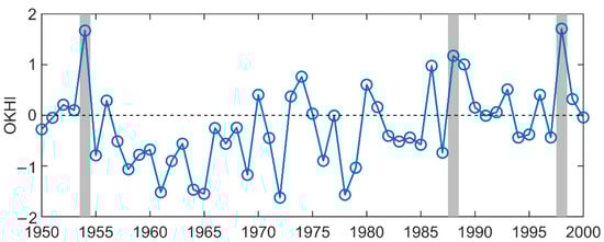 Okhotsk high index (OKHI) in summertime from 1950 to 2000, based on the geopotential height data in NCEP/NCAR reanalysis dataset [], the shadow indicates years that OKHI ≥ 1.0.