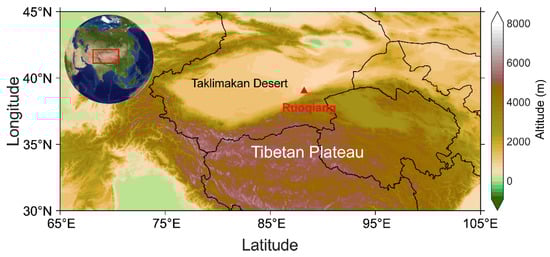Topography of the study area and its surroundings. The red triangle represents the Ruoqiang site (39.0°N, 88.2°E, 894 m ASL).