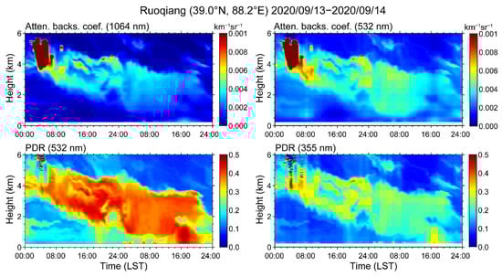 Figure 4 shows the vertical structure of clouds and dust aerosols detected by the ground-based polarization lidar at the Ruoqiang site (39.0°N, 88.2°E, 894 m) from 13 to 14 September 2020. The attenuated backscattering coefficient both at 1064 nm and 532 nm, and the PDRs at 532 nm and 355 nm, are shown. It can be seen that there was an obvious dust layer during the observed period, mainly distributed from the ground to 5 km height. The attenuated backscattering coefficients of the dust layer at 1064 nm and 532 nm were larger than 0.003 . PDR at 532 nm () was greater than 0.3, and that at 355 nm () was greater than 0.2, indicating highly non-spherical particles. It is similar to the typical values of dust aerosols observed by lidar in Dushanbe [65]. Regarding the dust event on 13 September, the dust layer was mainly distributed around 2–5.6 km height. In addition, the dust distribution exhibited an obvious stratification phenomenon. For example, the dust layer located at 2–5 km height from 8:00 to 16:00 was not distributed uniformly. On 14 September, the dust layer settled continuously with time, mainly distributed below 4 km. However, the layer was distributed at 5–6 km from 0:00 to 8:00, and then descended down to 4 km with time.