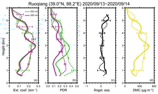 Vertical profiles of dust optical properties at Ruoqiang from 13 to 14 September 2020. Green and magenta lines represent profiles at 532 nm and 355 nm, respectively. The solid line is the averaged values from 11:00 to 12:00 (LST) on 13 September, and the dotted line is averaged values from 3:00 to 5:00 (LST) on 14 September. (a) extinction coefficients at 532 nm and 355 nm; (b) PDR at 532 nm and 355 nm; (c) extinction-related Ångström exponent (355 nm/532 nm); (d) DMC presents dust mass concentration calculated using a method proposed by Wang et al. (2021).