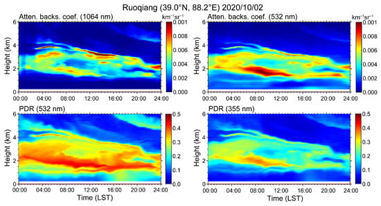 On 2 October 2020, CALIPSO lidar captured another dust event near Ruoqiang site. Figure 6 shows that the dust concentration was high, and the depolarization ratio and color ratio also showed large values, indicating that the dust particles had high non-sphericity and large particle size. Compared with the case on 14 September, the height of the dust layer for this case was higher. In particular, some dust aerosols were very close to the Tibetan Plateau at an altitude of 4–5 km. According to ground-based observation as shown in Figure 7, the dust layer was mainly distributed from 2 km to 4 km height, and the dust concentration near the ground was low. It can be seen that the dust intensity was large, but the dust was not evenly distributed in the vertical direction. For example, there was a thin layer of dust at about 4 km height from 2:00 to 6:00 (LST), and there was a thick layer of dust at 2–3.8 km height with high concentration. PDR at 532 (355) nm is larger than 0.3 (0.2), implying that the particles were highly non-spherical.