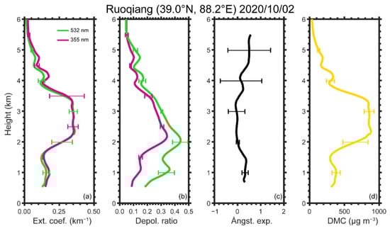 Vertical profiles of dust optical properties at Ruoqiang averaged from 2:00 to 5:00 on 2 October 2020. Green and magenta lines represent profiles at 532 nm and 355 nm, respectively. (a) extinction coefficients at 532 nm and 355 nm; (b) PDR at 532 nm and 355 nm; (c) extinction-related Ångström exponent (355 nm/532 nm); (d) DMC presents dust mass concentration calculated using a method proposed by Wang et al. (2021).