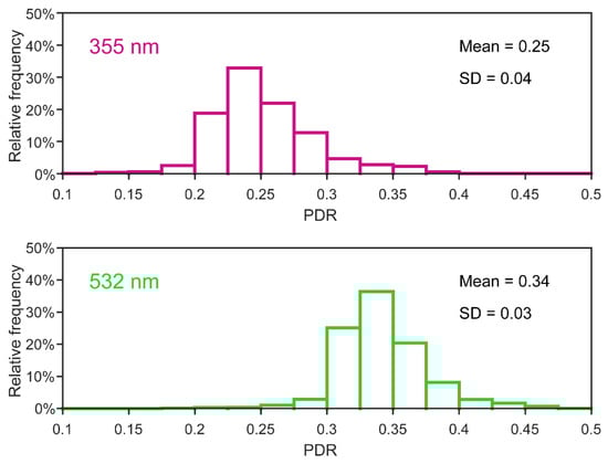 Frequency distributions of dust PDRs at 532 nm and 355 nm observed by the polarization lidar during September to October 2020 at Ruoqiang site (39.0°N, 88.2°E, 894 m). The total number of data points is 66, 300 for each panel.