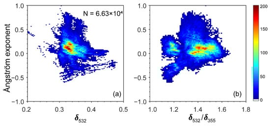 Figure 10 shows relationships between the PDR and extinction coefficient (532 nm) obtained from the polarization lidar from September to October 2020. The contoured color at panels represents the number of points for each grid. We can see that they are mainly distributed in the range of 0.1–0.4, and there is a strong linear correlation between the PDR at 355 nm and 532 nm. The averaged extinction coefficient of 532 nm is 0.22 ± 0.04 . In particular, the extinction coefficient increased with the PDR , indicating that of dust aerosol is positively correlated with non-sphericity. Analyzing the relationship between and is helpful for understanding the wavelength dependence of , of dust aerosol is greater than 1, and mainly concentrated in 1.3–1.5, which is consistent with the results reported by Huang et al. [67]. There is a negative correlation between and . The of dust aerosol is mainly about 0.15–0.3 .