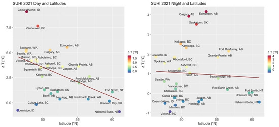 SUHI intensity (ΔT) vs. latitude for 28 cities (Table 1) during the 2021 HW at daytime (left) and nighttime (right).
