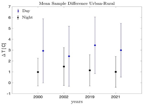 GEE was employed for download and pre-processing of MODIS imagery [95,96], for the computation of MODIS LST series during the period 2000–2021, for the estimation of average day and night MODIS-LST over cities and towns and for the estimation of SUHI intensity (differences between intraurban mean LST and its rural surroundings mean LST).