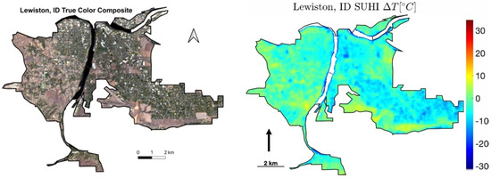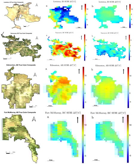 True color RGB composition maps and daytime SUHI intensity (ΔT) for four sample cities: Lewiston, Vancouver, Edmonton, and Fort McMurray.