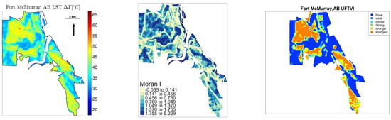 Spatial patterns of LST, Local Moran’s I (MLI), and UFTVI using Landsat-8 data over the cities of Fort McMurray, Edmonton, Vancouver, and Lewiston.