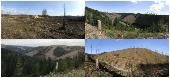 Photographs of typical drought- and bark beetle-affected areas in spruce forests with large-scale clear-cuts due to salvage logging, standing dead trees and small groups or individuals of standing live trees (usually of less common species, such as fir or larch). All photos were taken by F. Thonfeld.