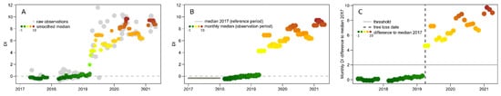 Major steps of the data processing exemplified at a disturbance index (DI) time series of a single pixel in a spruce forest in Southern Thuringia that became infested by bark beetle in 2018 and was cleared in April 2019. Processing includes median smoothing (A), computation of annual median for the reference period (2017) and monthly percentiles for the observation period (2018-April 2021) (B), and application of a threshold on the anomalies between monthly DI percentiles and the reference median to detect canopy cover loss (C).