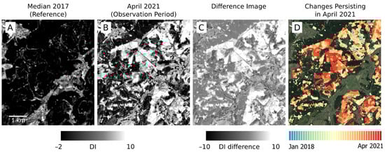 Deciduous trees often show high DI values in leaf-off conditions, which makes the winter detection of canopy cover loss ambiguous. During the last month of the observation period, April 2021, the deciduous trees were still senescent. The leaf-off situation can cause the false detection of changes. Therefore, we removed all detected canopy cover losses recorded in deciduous forests during the final winter months (November 2020–April 2021) as a post-processing step to obtain a realistic estimate. The application of the threshold to each monthly difference image resulted in a binary per-pixel time series, where 1 denotes detected tree-loss, usually a clear-cut area and hereafter called a hit, and 0 indicates that no clear-cuts or dead trees were detected. From this time series, several properties can be computed that determine the date of canopy cover loss, e.g., the first date of detected canopy cover loss, the start of a period of n consecutive hits, or the start of the last uninterrupted period of hits that persisted until the end of the observation period. We define as the date of canopy cover loss the point when two consecutive hits were detected for the first time in a time series, given that hits were also detected for this particular pixel at the end of the observation period. The workflow diagram is presented in Figure 4. Figure 5 shows an exemplary subset of a forest area during the reference period in 2017, in comparison to the situation at the end of the observation period in April 2021, the respective difference image and the resulting canopy cover loss areas.