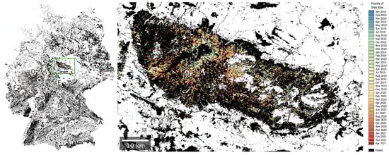 Remote sensing has proven to be valuable in detecting forest changes, particularly stand-replacing changes [,,,,,]. While the current focus is on satellite-based near-real-time alerting of changes in the tropical moist forests of Asia, Africa and South America [,], recent research also considers temperate forests. Of particular interest are the changes in response to storm events [] or insect pests [,,,,]; the European Forest Fire Information System (EFFIS) has already been operating a near-real-time alerting system since 2000 []. Generally, canopy cover loss alerts indicate likely changes in near-real-time, often with some measure of confidence [,], whereas annual change maps, such as the global forest change product of the University of Maryland [], show high confidence with regard to the detected changes actually being real changes on the ground. However, the latter typically use annual best-pixel composites [,,] or temporal metrics [,,] that lead to some ambiguity in correctly assigning a change to a particular year, as images taken under optimal conditions are typically weighted more heavily than winter acquisitions. Hence, changes happening late in a particular year are likely to be attributed to the next year.