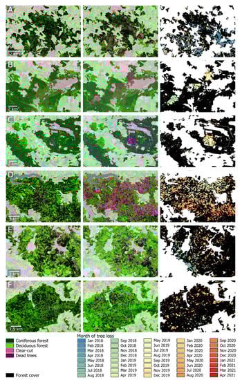 Validation of the temporal accuracy is amplified by the lack of appropriate data for most of the areas and most of the causes of tree mortality. The dying of the trees, the logging and their removal can take a certain time; therefore, the definition of tree death in response to droughts [] and, hence, the timing of canopy cover losses are ambiguous. There is evidence that the separation of standing dead (spruce) trees and live trees, as well as non-forest, is possible [], even though the process of change in spruce trees as they are dying is a gradient with several stages, such as green, red, and gray attack []. Generally, it is difficult to define exactly when a tree is dead [,,]. We map canopy cover loss as the date when trees are without photosynthetic activity, or when forests are cleared. The latter includes salvation and sanitary logging and forest harvest. In case of storm events and fires, canopy cover loss can be directly associated with a particular date. Even then, it can take some time before cloud-free situations allow for the acquisition of optical data. We evaluated the recorded dates of some known fires that were captured during the observation period.