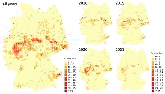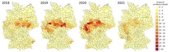 In 2018, the canopy cover loss area was still rather low as it took some time for the trees to die in response to the heavy 2018 drought. Most of the cleared areas seen in early 2018 are likely the result of the removal of windthrown trees in the aftermath of the 2017 summer storms (e.g., near Passau in Bavaria, southeast Germany, Figure 7a) and 2018 winter storms such as “Friederike” (e.g., in northern and eastern Germany). However, drought-induced mortality in beech and spruce trees had already started in 2018 []. Canopy cover loss was accelerated by bark beetle infestation in spruce trees, which started in 2018 and continued in several outbreak phases until 2021. Salvage logging as a radical management strategy had already started in 2018 in some federal states, such as Saxony-Anhalt, but accelerated through 2019 and 2020, particularly in Hesse and North Rhine-Westphalia. Consequently, the spatial pattern of canopy cover loss changed from larger areas in eastern and southeastern Germany in 2018 to dominant changes in central and western Germany in 2019, 2020 and 2021 (Figure 8). Considering all forest types, canopy cover loss was evident throughout Germany, even though northern and southern Germany were less affected than central Germany (Figure 8). Central western and eastern Germany were most heavily affected with regard to forest loss in coniferous forests. In a belt ranging from the western to the eastern borders of the country, a large share of the coniferous forests was cleared or dead, in some areas by more than three-quarters.