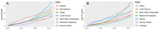 Canopy cover losses of the seven most affected federal states over time: (A) in terms of area, (B) in terms of percentage. Please note that the federal states differ in the two plots.