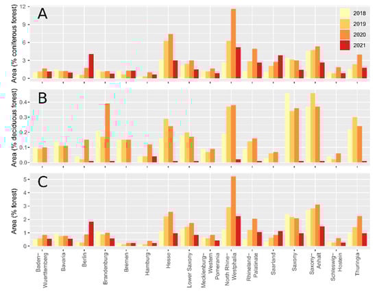 With regard to administrative levels, there are huge differences among the federal states and forest types. However, central German federal states, such as North Rhine-Westphalia, Hesse, and Saxony-Anhalt, were more affected than the northern and southern states.