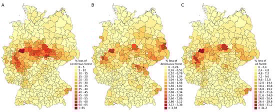 Losses in deciduous forests were highest in the districts of Harz (Saxony-Anhalt, 836 ha), Hochsauerlandkreis (North Rhine-Westphalia, 544 ha), Kassel (Hesse, 507 ha), Schwalm-Eder-Kreis (Hesse, 462 ha), and Hersfeld-Rotenburg (Hesse, 442 ha). With respect to percentages, the City of Hof (Bavaria, 3.5%), and districts of Soest (North Rhine-Westphalia, 3.0%), Rheinisch-Bergischer Kreis (North Rhine-Westphalia, 2.7%), Spree-Neiße (Brandenburg, 2.6%), and Sonneberg (Thuringia, 2.5%) were most affected. The largest percentage of forest loss, regardless of forest type, was recorded for the districts of Soest (North Rhine-Westphalia, 31.6%), Harz (Saxony-Anhalt, 27.9%), Oberbergischer Kreis (North Rhine-Westphalia, 27.8%), Altenkirchen (Westerwald) (North Rhine-Westphalia, 24.7%), and Osterode am Harz (Lower Saxony, 21.0%). In absolute numbers, the districts of Harz (Saxony-Anhalt, 20,456 ha), Hochsauerlandkreis (North Rhine-Westphalia, 13,006 ha), Siegen-Wittgenstein (North Rhine-Westphalia, 12,077 ha), Goslar (Lower Saxony, 10,231 ha), and Märkischer Kreis (North Rhine-Westphalia, 9584 ha) show the highest forest loss for all forest types.