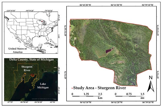 Geographical location of Sturgeon River watershed and image of research area presented by RGB composition using bands 1, 2 and 3 from the NAIP imagery.