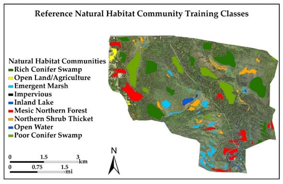 Selecting or developing an appropriate ecological classification scheme is critical for the classification to be useful for the end user. There are numerous existing classification schemes [8,10,11,12], and selection of an inappropriate scheme can limit the end product’s accuracy and utility. To classify a landscape, whether in situ or using remotely sensed data, it is important to have a classification scheme which reduces or eliminates confusion between various landscape features requiring separation [13]. Traditionally, many resource management agencies (federal, state and private) use field-sampled regional vegetation classes focusing on the dominant vegetation species while ignoring associated plants, animals and other organisms which are repeatedly found under similar environmental conditions [14], focusing on describing native ecosystem types minimally impacted by anthropogenic activities [12]. For this study, the hierarchical classification framework of Cohen et al. [12] was utilized. “Natural Communities of Michigan: Classification and Description”, published by the Michigan Natural Features Inventory (MNFI), provides detailed information on separating Michigan’s complex landscape into understandable and describable groups called natural habitat communities. The foundation of this classification is based on the work completed by Chapman [15] and first published by Kost et al. [16]. It is important to understand the difference between a plant community, such as the ones used in the national land cover classification [17], and a natural habitat community [12]. The latter differs from other hierarchical classification schemes in that Cohen et al. [12] regard such a community as “an assemblage of interacting plants, animals, and other organisms that repeatedly occur under similar environmental conditions across the landscape and are predominantly structured by natural processes rather than modern anthropogenic disturbances”.