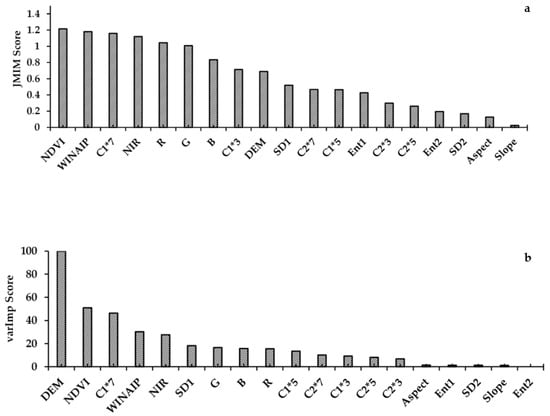 Ancillary data importance scores using (a) JMIM and (b) RF-based varImp calculations. R—red, G—green, B—blue, NIR—near-infrared, DEM—digital elevation model, Slope—slope, Aspect—aspect, C1—contrast texture (PC1, 7 × 7 moving window), C2—contrast texture (PC2, 7 × 7 moving window), Ent1*7—entropy texture (PC1, 7 × 7 moving window), Ent2*7—entropy texture (PC2, 7 × 7 moving window), SD1*7—standard deviation texture (PC1, 7 × 7 moving window), SD2*7—standard deviation texture (PC2, 7 × 7 moving window), NDVI—normalized difference vegetation index, WINAIP—modified water index–NAIP, C1*3—contrast texture (PC1, 3 × 3 moving window), C2*3—contrast texture (PC2, 3 × 3 moving window), C1*5—contrast texture (PC1, 5 × 5 moving window), C2*5—contrast texture (PC2, 5 × 5 moving window). Note: varImp score for Ent 2 = 0 (no bar).