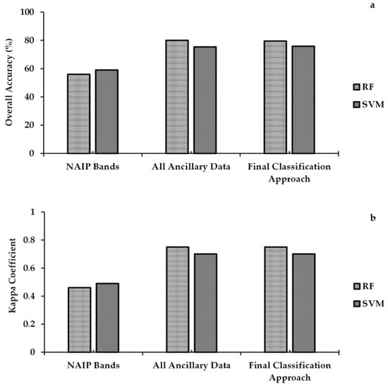 Ancillary datasets such as NAIP (National Agriculture Imagery Program) multispectral bands, DEM, aspect, slope, spectral indices and PC1- and PC2-based texture layers were selected by implementing the feature selection method. The utility of these input datasets was determined and compared for the automated MLAs. The ancillary data were selected not only based on the variables’ importance but also on the OA and k values as well. Both of the feature selection methods (i.e., JMIM and varImp) proved to be important for observing differences in ancillary data contributions to the MLA accuracies (Figure 4a,b).
