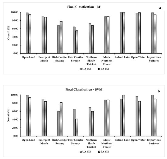 Both RF and SVM showed major confusion between RCS, PCS and NST classes. RCS and PCS have a variety of tree species of similar types, which can cause confusion in the classification. NST is another community class which shares similar vegetation types with RCS and PCS, and also showed lower UA and PA (Figure 9a,b). Due to the close spectral similarities between these classes, they have a lower UA and PA overall compared to other classes (Figure 9a,b). Classes with higher spectral dissimilarity showed maximum accuracy (i.e., OL, EM, MNF and IL) and vice versa. Considering the overall UA and PA for the community classes, we see that in general, RF (Figure 9a) performed better than SVM (Figure 9b). For example, all five natural habitat community classes (EM, RCS, PCS, NST and MNF) showed better or similar UA and PA values compared to SVM (Figure 9a,b).