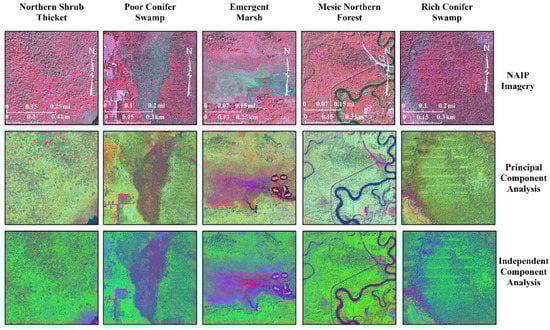 To fully utilize spectral reflectance information, and reduce redundant information between bands, an integrated approach to spectral transformation techniques (principal components analysis (PCA) and independent components analysis (ICA)) were utilized. PCA is a widely employed transformation using a linear transformation, and it generates uncorrelated components [64,65]. PCA-derived components have been used to map wetlands vegetation, assess change detection and evaluate vegetation anomalies and identify geological features [66,67,68,69,70]. PCA uses second-order statistics and assumes the data are normally distributed and correlated. PCA has been utilized since the launch of the Landsat 2 Multispectral Scanner which consisted of 4 bands [71]. ICA considers higher-order statistics, and each transformed component is considered to be non-Gaussian [72]. ICA has been shown to identify details in an image even when the feature occupies a small area [73]. However, it has not been extensively used in vegetation and land use/cover classification [70,74,75,76]. Both PCA and ICA were used to draw accurate training classes for the MLA. The components of the PCA transformation were not used in the classification process, as components 3 and 4 contained information critical to delineating the emergent marsh natural habitat communities.