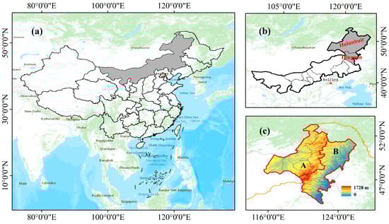 The study area is within the Hulunbuir city and Hinggan League (115°31′–126°04′E, 44°14′–53°20′N) in the Inner Mongolia Autonomous Region of China (Figure 1), covering a total area around 310,000 km2. This mountainous area is composed of primarily smallholder farmlands. Given the regional differences in natural conditions (e.g., temperature and precipitation) and agricultural practices (e.g., crop types and planting dates), the study area was divided into two agro-ecological zones (AEZs) to facilitate the classification (Figure 1c).