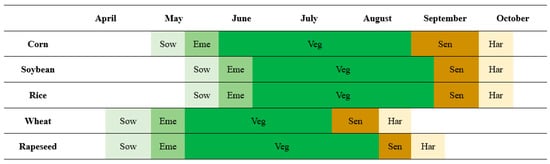 The crop phenologies of crops vary across the study area (Figure 2). Wheat and rapeseed are sown simultaneously (about April 15), but wheat’s ripening and harvest stages are about two weeks earlier (August 15 for wheat and September 1 for rapeseed). Although corn, soybean, and rice are harvested in early October, corn is sown two weeks before soybean and rice (around May 5 for corn, May 20 for soybean and rice) [58,59]. In addition, wheat and rapeseed are grown a month earlier than are soybean and rice.