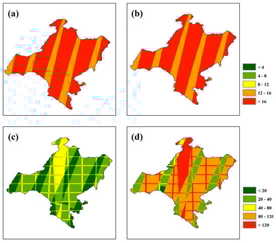 The Sentinel-1 frequency over study area from April to October in (a) 2017 and (b) 2018, the Sentinel-2 frequency in the same season of (c) 2017 and (d) 2018.