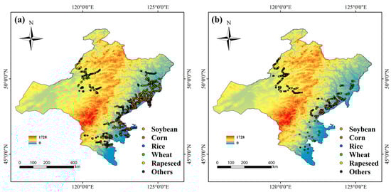 We collected ground truth data during the crop growing seasons in 2017 and 2018. The location of each crop field was recorded with a geographic positioning system (GPS), and the corresponding field information was recorded manually. The field samples collected were mainly crops. Other land cover types such as forests, built-up, and water bodies were not gathered as they were not the focus of this study. We acquired a total of 2412 sample points in 2017 (soybean: 666, corn: 703, rice: 45, wheat: 534, rapeseed: 167, others: 297) and 2487 sample points in 2018 (soybean: 396, corn: 755, rice: 38, wheat: 368, rapeseed: 434, others: 496). The spatial distribution of sample points is shown in Figure 4.