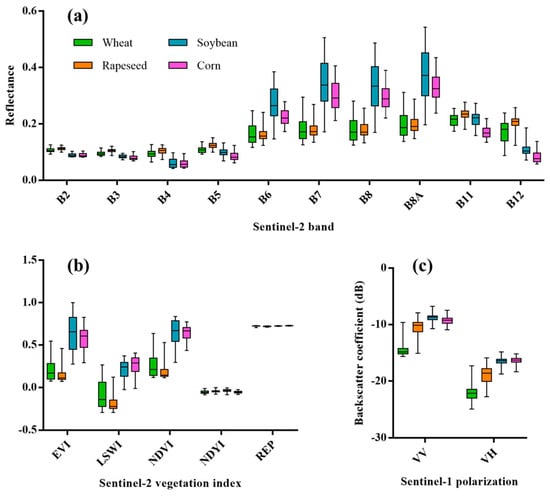 Compared with wheat and rapeseed, soybean and corn were shown to have an opposite performance in feature discrimination. While soybean has higher NIR and SWIR values, there were no noticeable differences in VIs and Sentinel-1 polarizations. Soybean and corn have higher values than wheat and rapeseed in all features except visible and SWIR bands. There was no significant difference in vegetation indices between wheat and rapeseed, and between soybean and corn (Figure 5b). It seems then that optical imagery has better performance in soybean and corn discrimination, and SAR features have better potential in wheat and rapeseed identification.