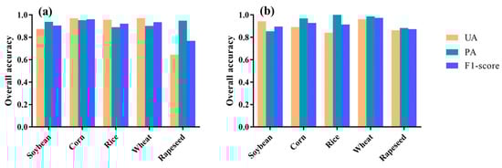The classification accuracy of different crop types in (a) 2017 and (b) 2018.
