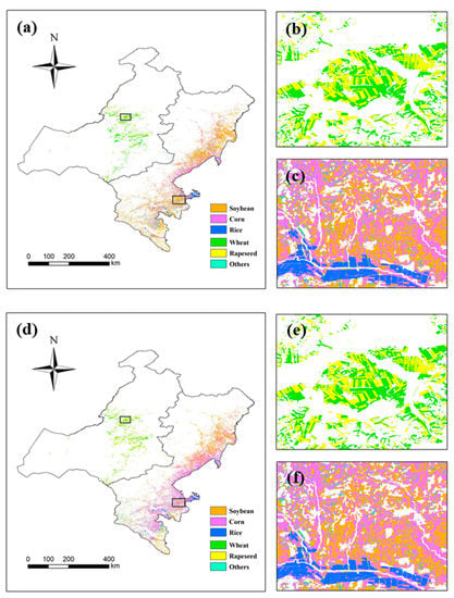 The crop type distributions of (a) 2017 and (d) 2018 over the study area; (b,c) are the close-up views of (a) for the AEZ A and B; (e,f) are the close-up views of (d) in the same regions of (b,c).