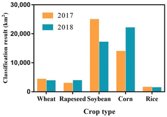 The consistent classification of crop type in 2017 and 2018 revealed the significant inter-annual changes in crop distribution (Figure 10). It is essential for developing countries like China to balance environmental sustainability, agriculture, and food security with limited cropland resources and large populations. To this end, the crop planting area and structural adjustment policies were conducted in northeast China in recent years. The policy incentivized frequent crop rotations of different crops [57,60,61]. It was the main reason we could observe the widespread rotations in corn–soybean or wheat–rapeseed over the study area. Limited by field surveys, only two years of crop type were mapped, but the consistent observations have the potential for multiple-year crop rotation assessments [19,60].