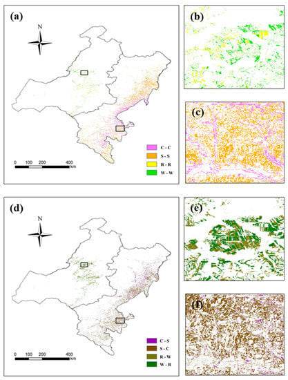 The distribution of crop (a) rotation and (d) non-rotation areas in the study area. (b,c) are the close-up views of (a); (e,f) are the close-up views of (d). (Note: W: Wheat, R: Rapeseed, S: Soybean, C: Corn).