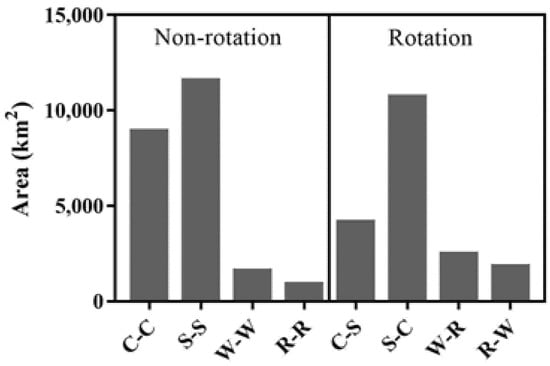 Rotation and non-rotation areas of different crop types from 2017 to 2018. (Note: W: Wheat, R: Rapeseed, S: Soybean, C: Corn).