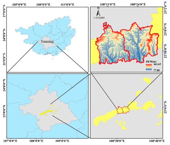 Gaofeng forest farm is situated in Nanning, Guangxi Zhuang Autonomous Region, China. This region has a humid subtropical monsoon climate with an average annual temperature of 21 °C and an average annual precipitation of 1200–1500 mm. Typical tree species in this farm are Eucalyptus, Chinese Fir, Masson Pine, and other broad-leaved tree species. The study area is located in two sub-farms named Jiepai and Dongsheng within the Gaofeng forest farm with an area of 52 km2 (Figure 1). The slope ranges from 0° to 69.7°, and the elevation ranges from 77 to 463 m.