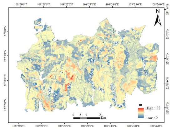 Spatial distribution of canopy height derived by LiDAR data covering the study area.