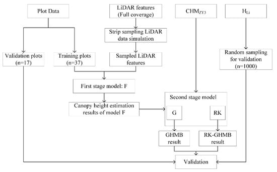 Although the RK model has better performance than some regression models when spatial autocorrelation exists between units for parameter estimation, it has not been used in the second stage of either HMB or GHMB. Assuming that we can improve the performance of GHMB by replacing the regression model with the RK model in the second estimation stage, one general forest parameter estimation and uncertainty estimation framework named RK-GHMB has been developed in this paper. The validation of RK-GHMB was carried out through forest canopy height estimation by the combined use of ground plot data, sampled LiDAR data, and Ziyuan-3 satellite (ZY3) stereo images.