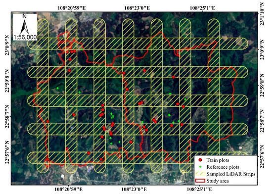 Twelve strips of LiDAR data were sampled, assuming that only these areas were available for obtaining LiDAR data in a practical application. The selected strips that covered the 37 train plots are shown in Figure 5. Each strip was 600 m wide and the distance between the center lines of these strips was 1500 m. The simulated strips covered about 65% of the study area. A total of 37 field plots were selected as training data to build the first stage regression model combined with LiDAR data named model F. A total of 3000 pixels of canopy height estimated by model F were used to build the second stage model. The left 17 field plots and the 1000 pixels randomly selected from HLi were used as two kinds of validation data, named plot-based and LiDAR-based reference data, respectively. It is important to emphasize that these LiDAR-reference validation data are different from those 3000 pixels used to build the second stage model. For the convenience of subsequent descriptions, we named the datasets used in the first and second regression models as S and Sa, respectively.