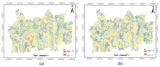Spatial distribution of canopy height estimated by model GHMB (a) and model RK-GHMB (b).