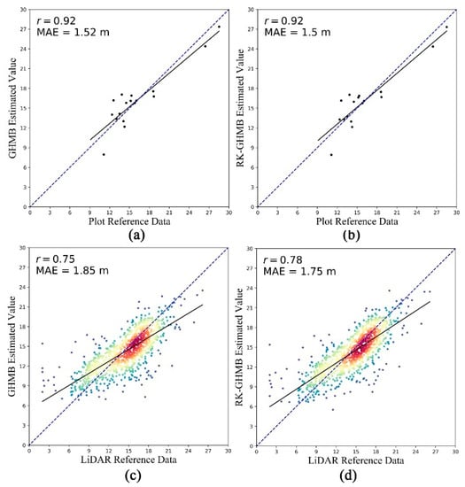 Plot-based (a,b) and LiDAR-based (c,d) reference data vs. the GHMB- and RK-GHMB-estimated values.