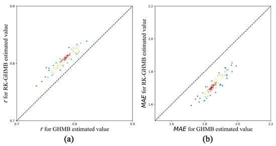 We used plots and the LiDAR-derived forest canopy height as testing reference data to compare the performance of GHMB and RK-GHMB for forest canopy height estimation. Figure 8 shows the scatter plots, and Table 4 presents the accuracy of these estimation results. The plot-based and for GHMB are 0.92 and 1.52 m, while for RK-GHMB, the values are 0.92 and 1.50 m. The LiDAR-based and for GHMB are 0.75 and 1.85 m, while for RK-GHMB, the values are 0.78 and 1.75 m. The accuracy of the two models is similar to that of the plot-based reference data. However, the RK-GHMB model has a higher and a lower compared to the LiDAR-based reference data. In order to further prove the effect of improving the accuracy, we randomly selected 1000 LiDAR-based reference data 100 times in order to check the accuracy and obtain two groups of r and MAE. Then, we checked whether there was a significant difference between the two groups. Figure 9 shows the corresponding r and MAE for the two estimation frameworks. According to the Wilcoxon test, a significant difference (p < 0.05) was seen between the accuracy of GHMB and RK-GHMB. This comparison shows that the additional prediction of residuals by kriging can increase the estimation accuracy.