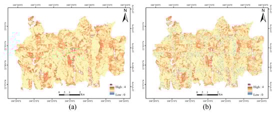 The uncertainty maps of GHMB and RK-GHMB are shown as Figure 10. The uncertainties estimated by GHMB ranged from 1.84 to 3.60 m. However, the uncertainties estimated using RK-GHMB ranged from 1.54 to 3.60 m. In Figure 10b, the RMSE of most map units seems to be lower than that in Figure 10a; this means that RK-GHMB can obtain a higher accuracy in forest height estimation with a lower uncertainty. From Figure 10b, we can see that the pixels with a higher uncertainty reduction are located near the twelve sampled LiDAR data strips.