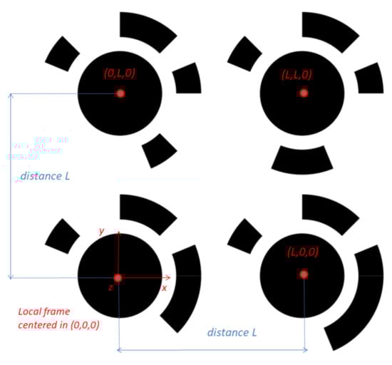 For this study, the chosen patterns are constituted of a constellation of circular shapes (see Figure 1) but can be changed for other rigid patterns such as ARTag [] without loss of generality. By assuming that the patterns have a known given size L, the pose of a pattern in the global frame can be represented as a 3D affine transformation. The latter is composed of a rotation and a translation and can be associated to the set of matrices defined in the special Euclidean group , which has the structure of a Lie group (LG). The aim of this article is to rewrite the camera model in order to express the camera pose, as well as the pose of each landmark, in to reformulate the VSLAM problem as a recursive estimation problem on LGs.