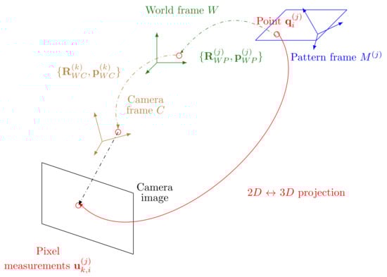 At each instant k, a fiducial pattern detector provides the 2D coordinates of the center of each ellipse, , associated to the 3D point of pattern j in the world frame. According to the pinhole camera model, the reprojection function provides the mathematical relation linking and , such as: