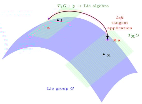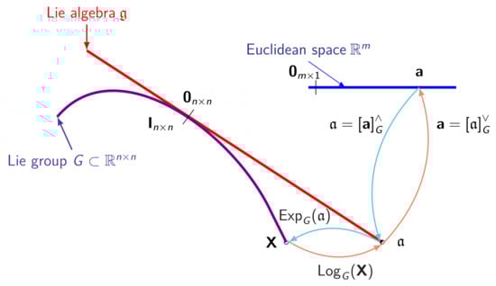 We can establish a relation between G and through the exponential mapping, , and its reciprocal, the logarithm mapping, . They are locally bijective. The mathematical expressions of these operators can be found in [,,].