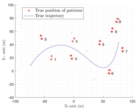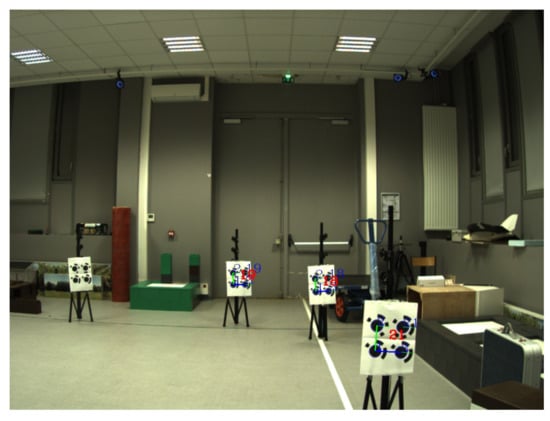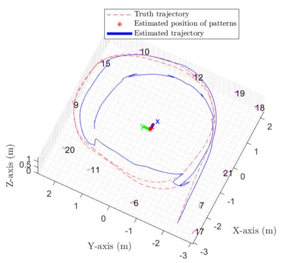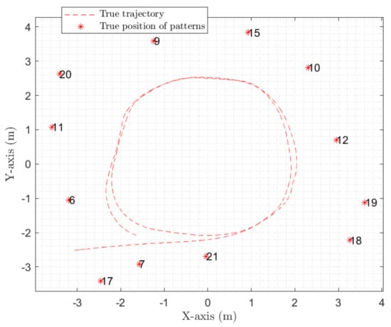 To overcome these difficulties, we propose in this study the use of fiducial or coded markers as landmarks [,,]. The main advantage of such patterns is that they reduce the number of landmarks while solving the association step, thanks to labelled detections. Moreover, even if it is required to instrument the environment with coded patterns, a priori knowledge of the absolute position of one of the artificial landmarks would allow precise absolute localization.